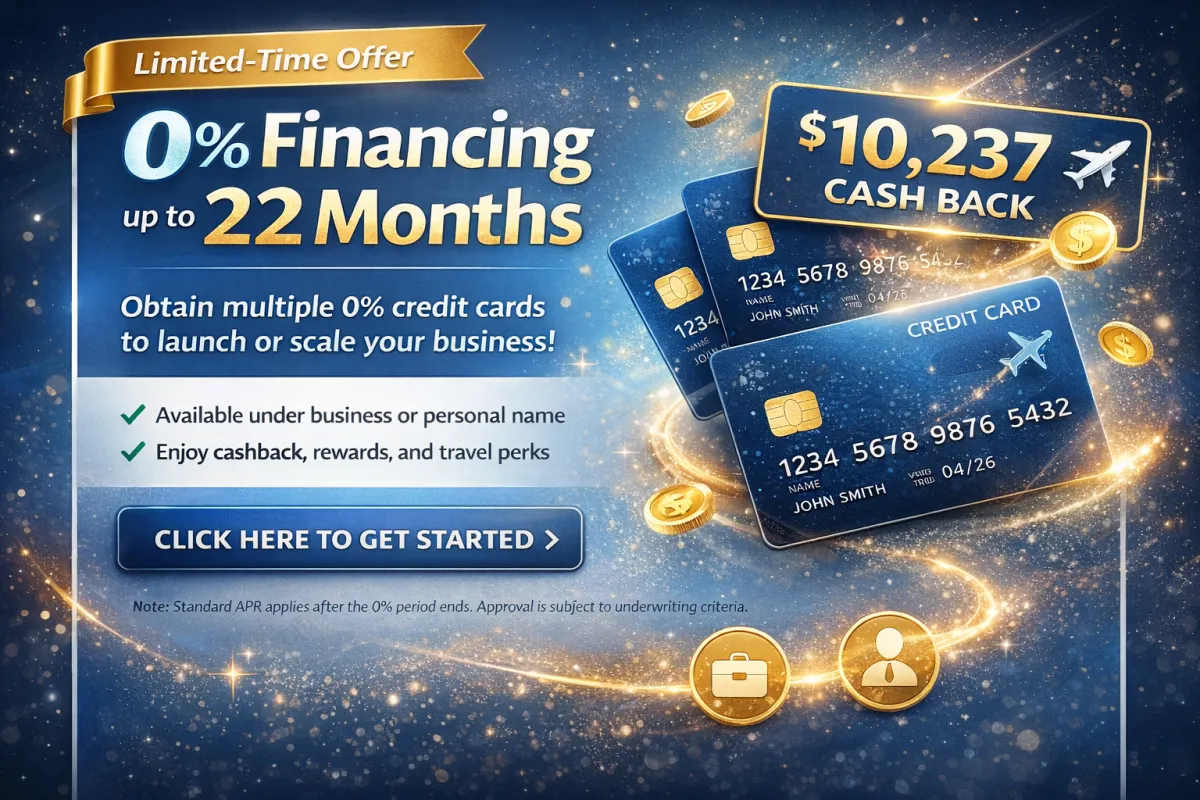If you are not a business owner, we invite you to take advantage of our Personal Credit Card Stacking Program a powerful way to position yourself for future business ownership. For qualified clients, we provide access to up to $100,000 at 0% interest for as long as 22 months. Imagine the possibilities: starting your business, covering initial expenses, and building momentum all with nearly two years of interest-free funding to put your plans into motion.